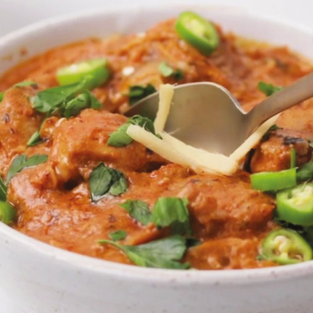 Boneless chunks of fresh chicken marinated overnight, grilled and cooked in a smooth buttery tomato-based gravy, garnished with boiled egg for a classic finish.